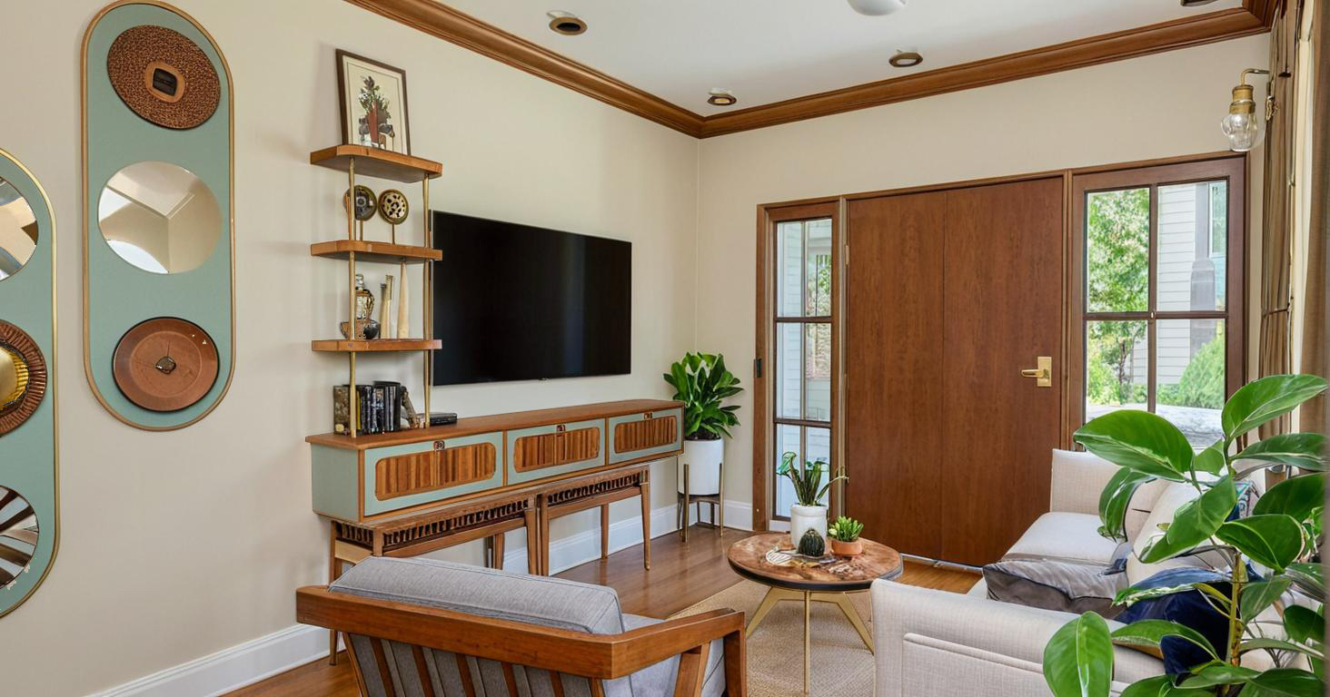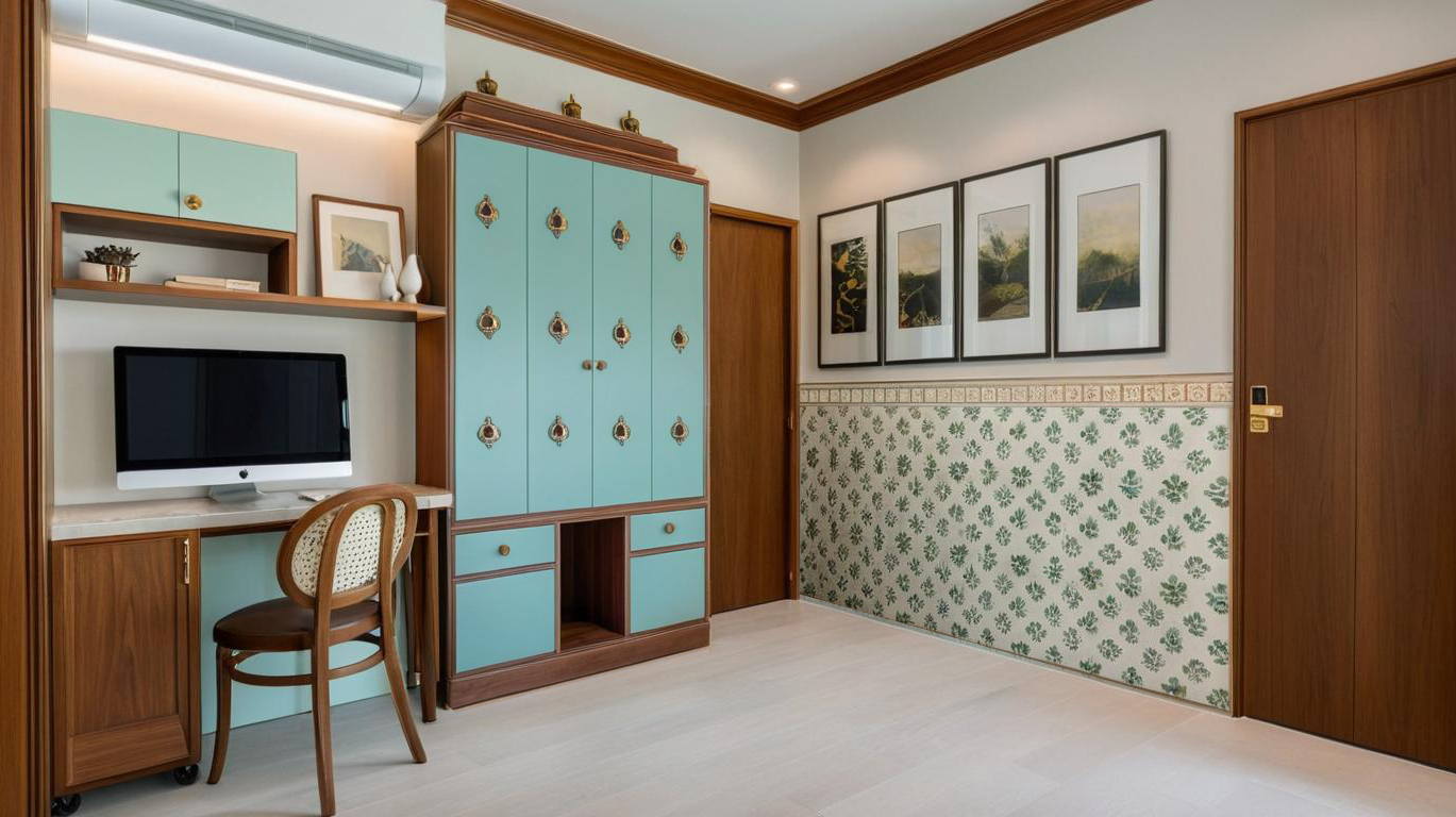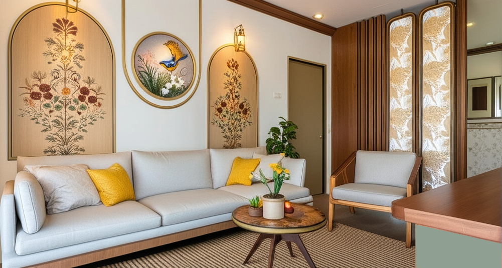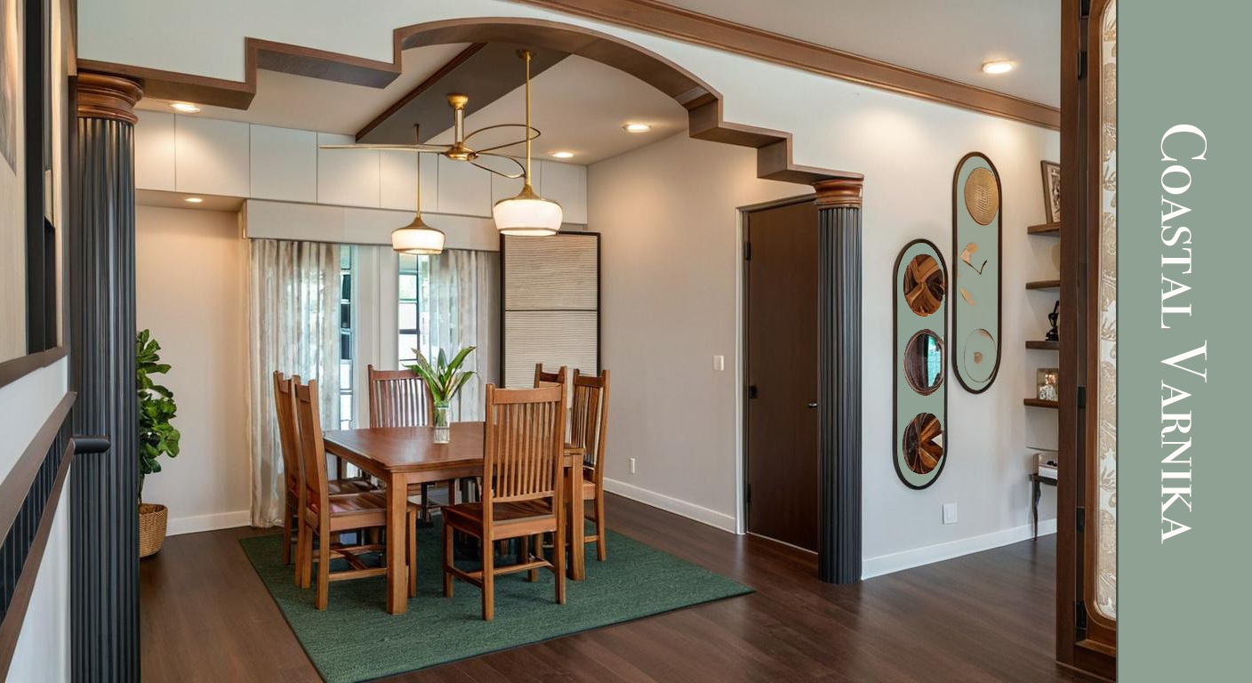A key feature of this home is the thoughtful incorporation of manual artwork inside arched niches. These handcrafted pieces replaced the expected wallpapers and were developed in collaboration with artisans, ensuring that every arch told its own story. Each niche is edged with subtle wall beading, transforming it into a design feature while also serving a functional purpose — creating a space to display curated wall plates that reflect the home’s thematic narrative. The layout presented a design challenge: a long, linear hall that lacked spatial definition. We addressed this by introducing a custom-designed movable partition, enabling the space to shift between open living and intimate privacy based on daily needs. This intervention redefined the usability of the space without introducing bulk or visual noise.